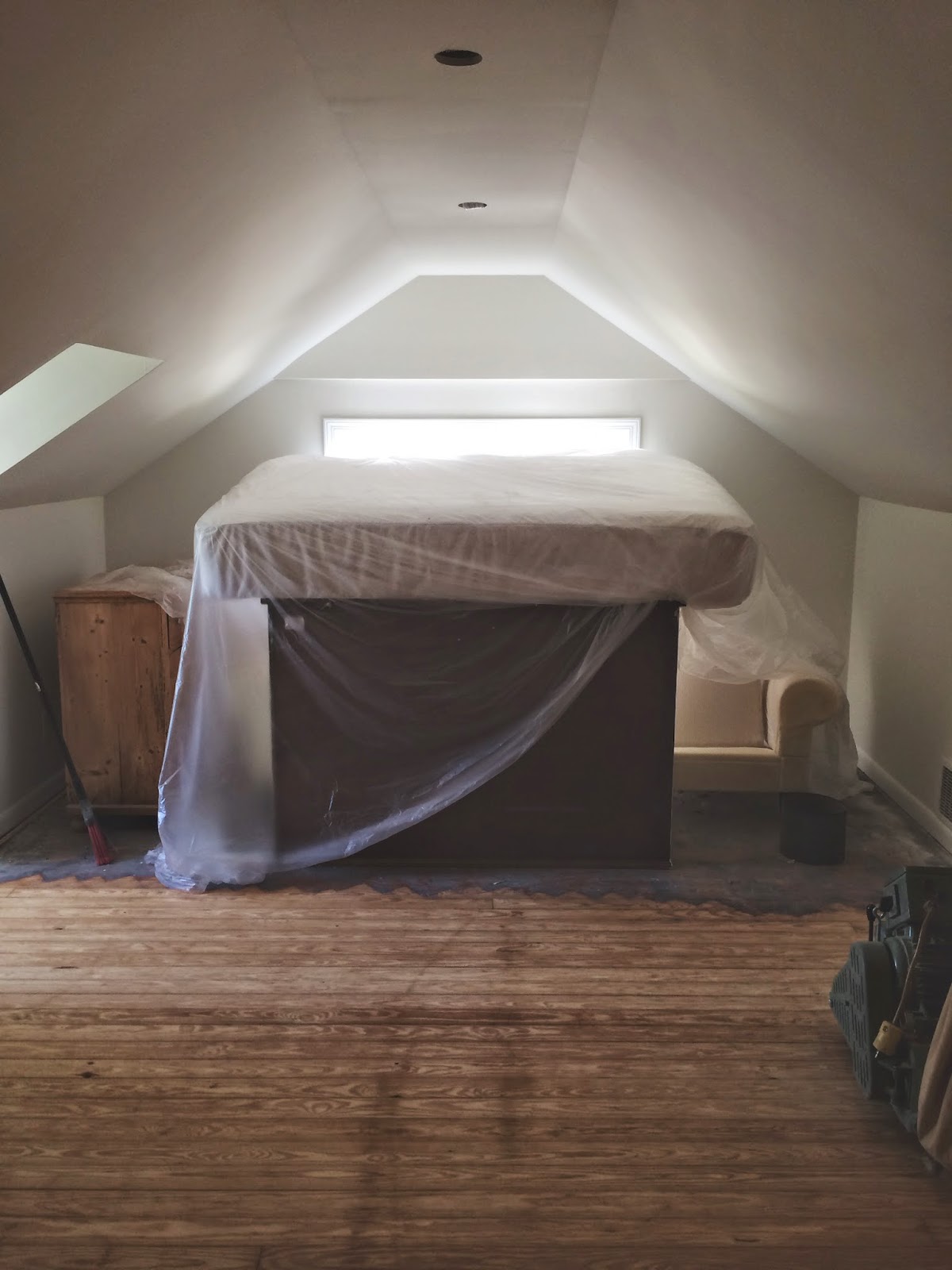While we were out and about, my favorite floor guys put on a coat of sealer in the bedroom and a coat of stain upstairs. It's looking good!