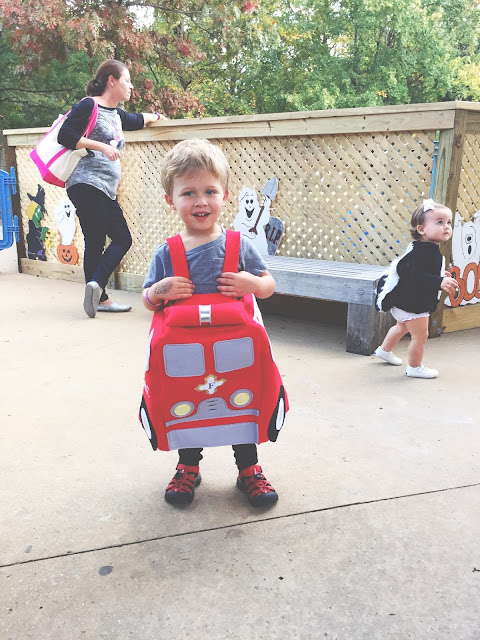 Our little candy-eating stinker drove around with Daddy in the Bad Boy Buggy, while Mommy and Brooks walked ran from house to house. My sweet, shiny red fire truck approached each doorstep making siren noises and was sure to tell every one who dropped candy into his basket, "thank you."