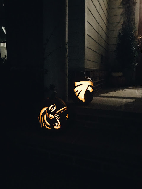 Tonight we finally finished carving our pumpkins. Brooks chose to carve a falcon and Ann Bennett requested a unicorn! Daddy had his work cut our for him (no pun intended)!